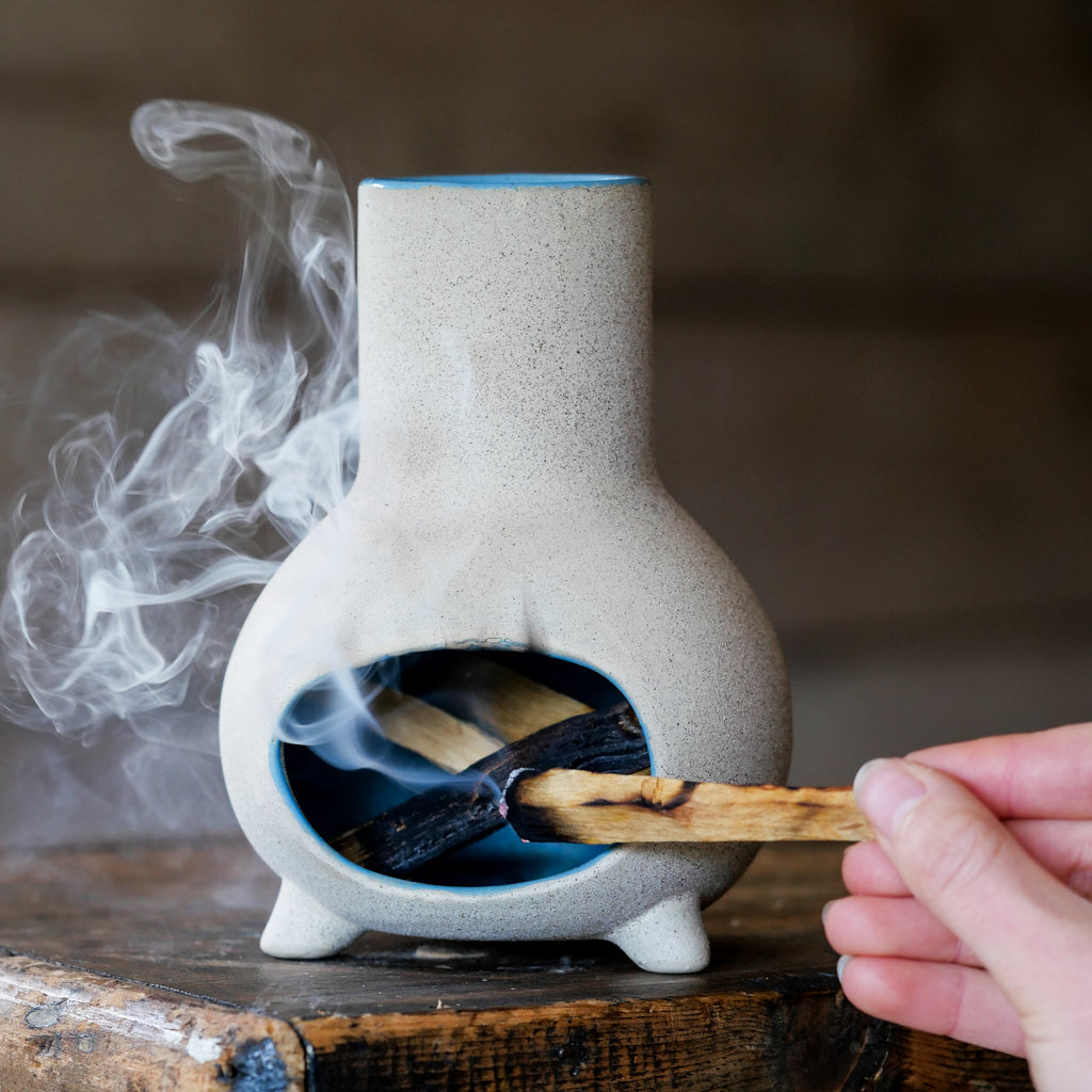 Crafted in small batches, this handcrafted mini chimenea blends natural charm with purposeful design. Each piece features a serene blue glazed interior, perfect for gently smouldering smudge sticks, Palo Santo, or incense cones. Ideal for sacred corners, or meditation spaces, it offers a safe, beautiful way to deepen your rituals and invite calm.